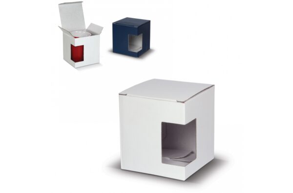 Blå (standard) eller hvid gaveæske til et krus med et vindue.